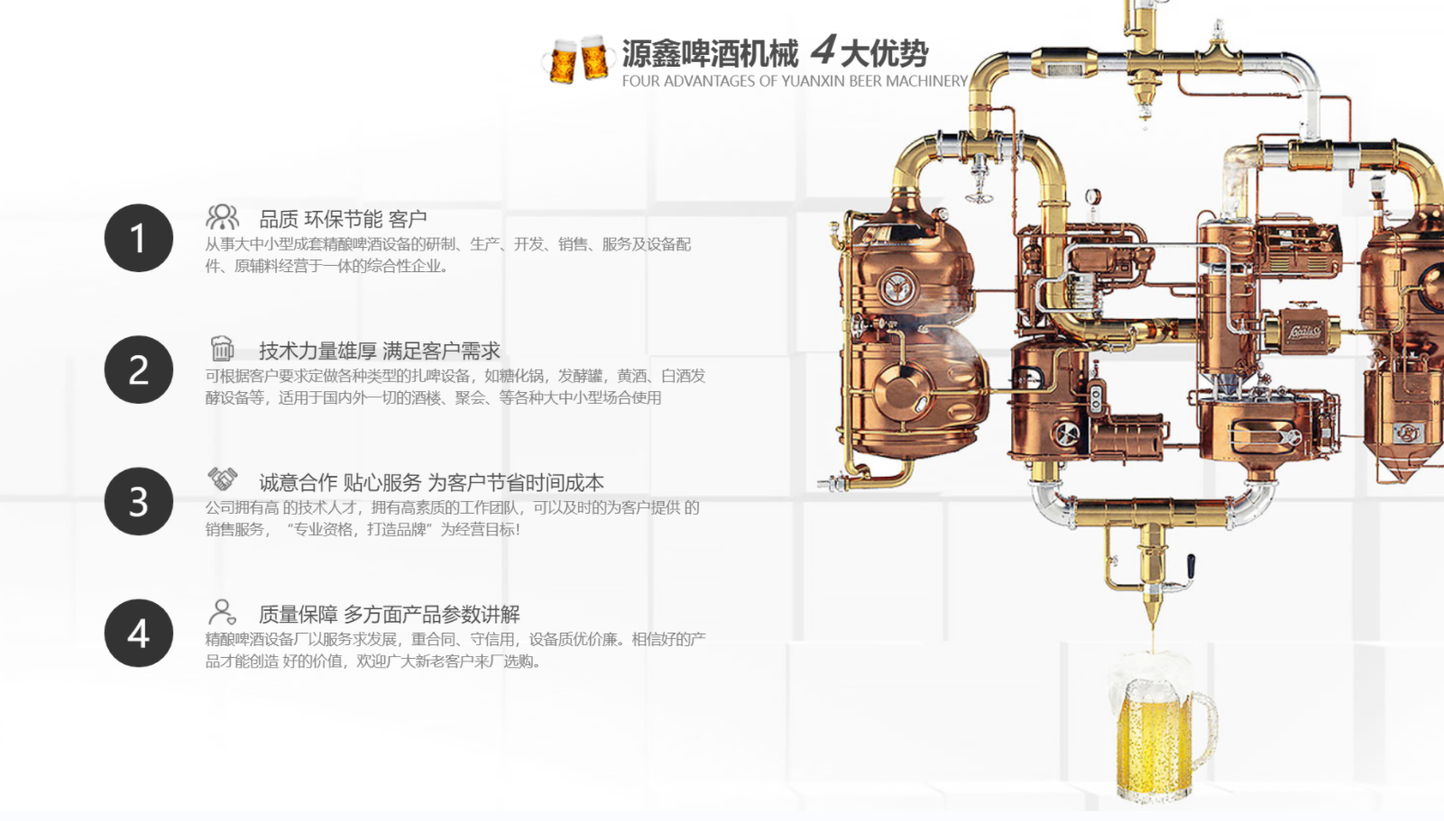 南陽市源鑫啤酒機(jī)械設(shè)備有限公司位于歷史文化名城一-南陽,從事大中小型成套啤酒、白酒自釀設(shè)備的研制、生產(chǎn)、開發(fā)、銷售、服務(wù)及設(shè)備配件、原輔料經(jīng)營(yíng)于一體的綜合性企業(yè)。公司可根據(jù)客戶要求定做各種類型的扎啤設(shè)備,如糖化鍋,發(fā)酵罐,黃酒、白酒發(fā)酵設(shè)備等,適用于國(guó)內(nèi)外一切的酒樓、餐廳、家庭.聚會(huì)、酒吧等各種大、中、小型場(chǎng)合使用。公司擁有技術(shù)人才,擁有高素質(zhì)的工作團(tuán)隊(duì),可以及時(shí)的為客戶提供**的銷售服務(wù)。公司以“專業(yè)資格,打造品牌”為經(jīng)營(yíng)目標(biāo),“卓越質(zhì)量,信賴價(jià)格”為經(jīng)營(yíng)宗旨,以質(zhì)量求生存,以服務(wù)求發(fā)展,重合同、守信用,設(shè)備質(zhì)優(yōu)價(jià)廉。相信好的產(chǎn)品才能創(chuàng)造 好的價(jià)值,歡迎廣大新老客戶來廠選購。...